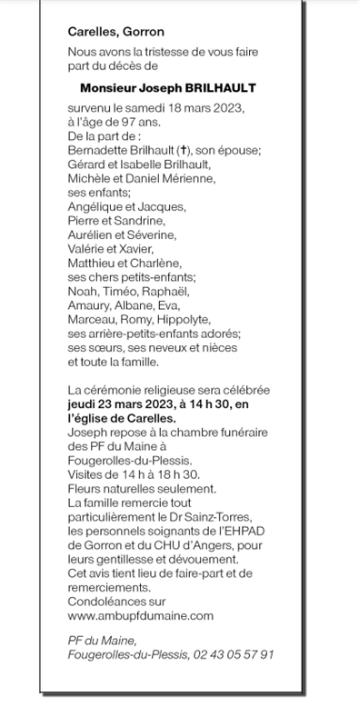 Annonce nécrologique de Monsieur Joseph BRILHAULT
