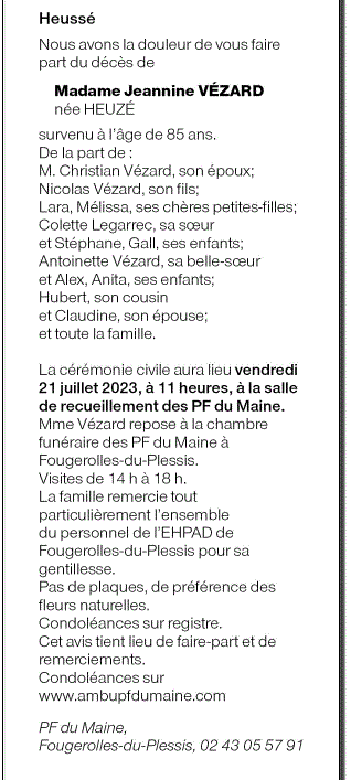 Annonce nécrologique de Mme Jeannine VÉZARD née HEUZÉ