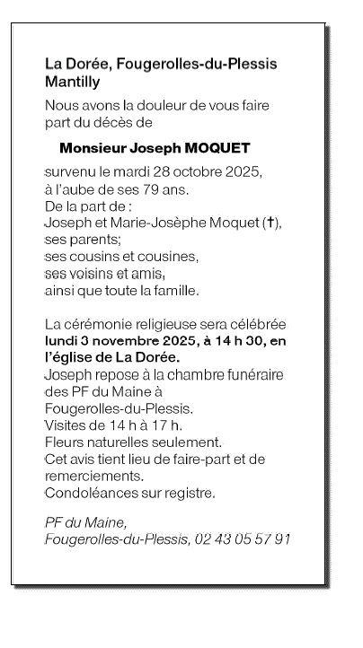 Annonce nécrologique de Monsieur Joseph MOQUET