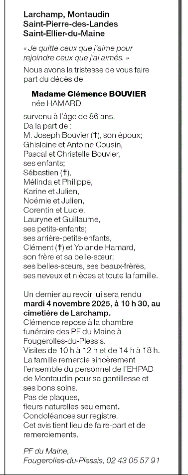 Annonce nécrologique de Madame Clémence BOUVIER née HAMARD