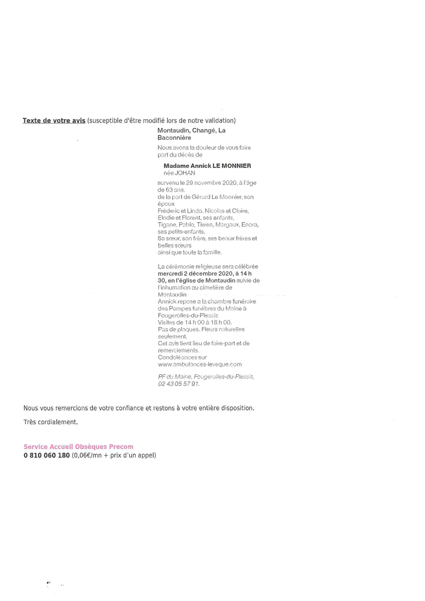 Décédée à Montaudin (53220, France) le dimanche 29 novembre 2020 à l'âge de 63 ans