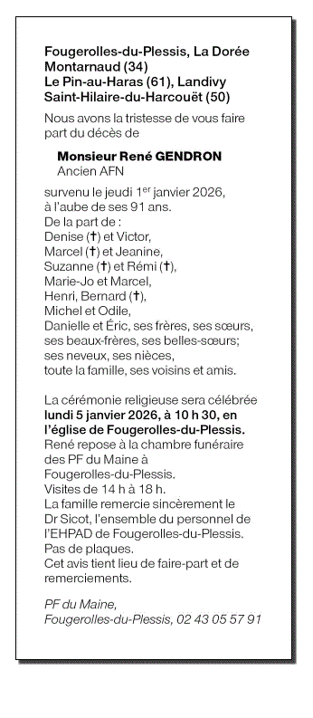 Annonce nécrologique de Monsieur René GENDRON