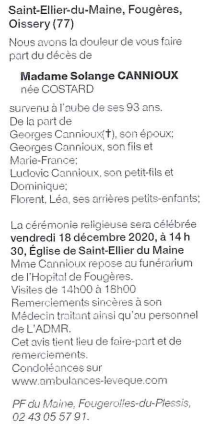 Annonce nécrologique de Solange CANNIOUX née COSTARD