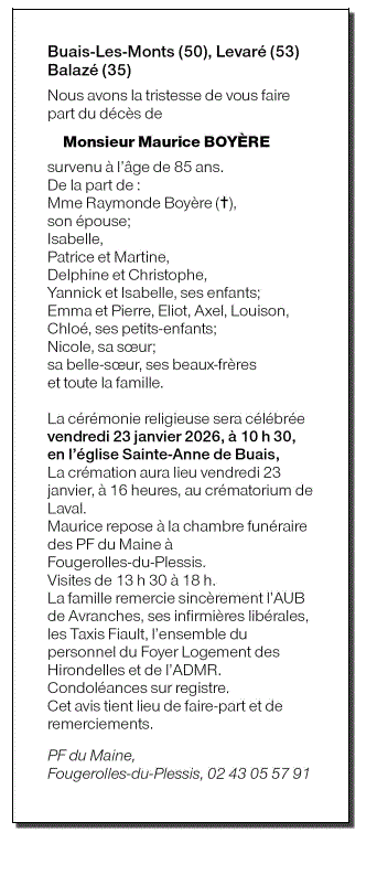 Annonce nécrologique de Monsieur Maurice BOYÈRE