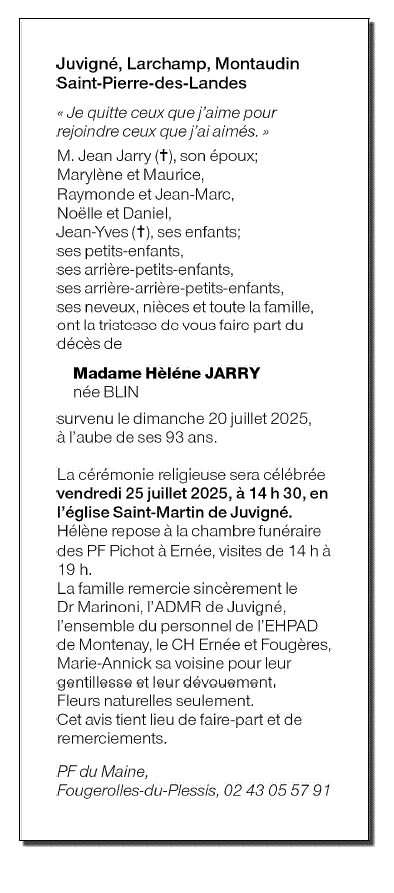 Annonce nécrologique de Madame Hélène JARRY née BLIN