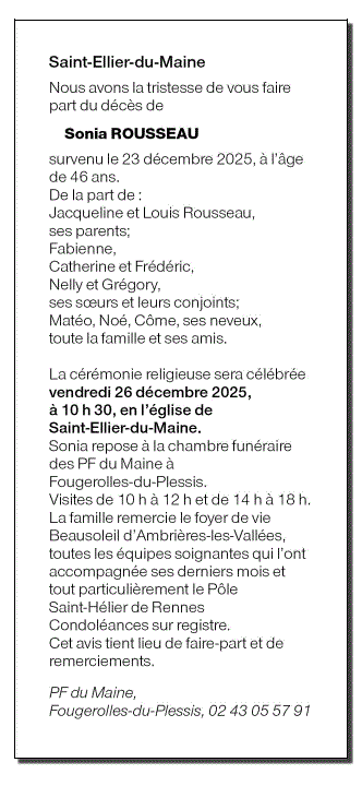 Décédée à Fougères (35133, France) le mardi 23 décembre 2025 à l'âge de 46 ans