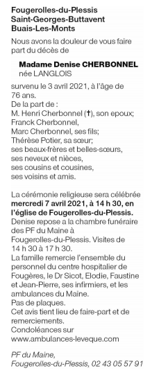Annonce nécrologique de Madame Denise CHERBONNEL née LANGLOIS