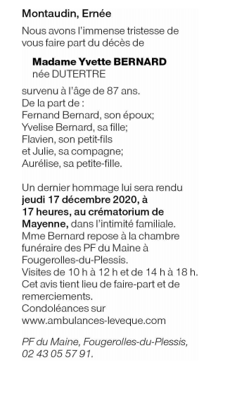 Annonce nécrologique de Madame Yvette BERNARD née DUTERTRE
