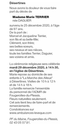 Décédée à Desertines (53190, France) le vendredi 25 décembre 2020 à l'âge de 97 ans