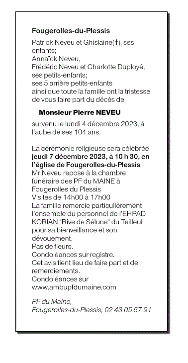 Annonce nécrologique de Monsieur Pierre NEVEU