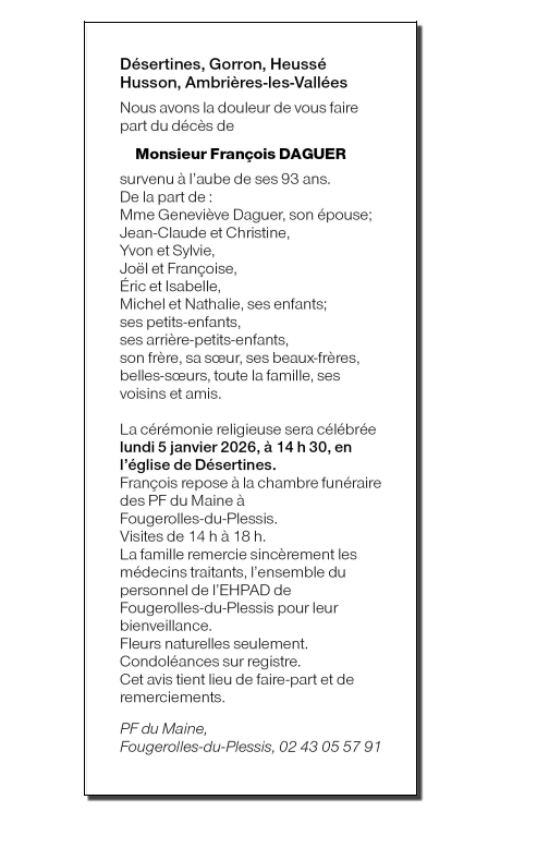 Annonce nécrologique de M. DAGUER François