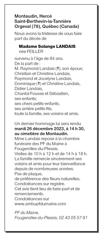 Annonce nécrologique de madame Solange LANDAIS née FEILLER