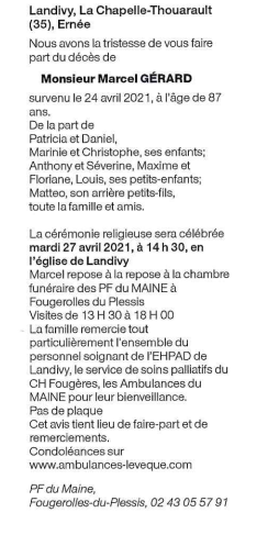 Décédé à Fougères (35133, France) le samedi 24 avril 2021 à l'âge de 87 ans