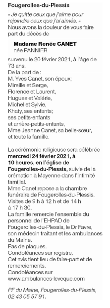 Annonce nécrologique de Mme Renée Canet née Pannier
